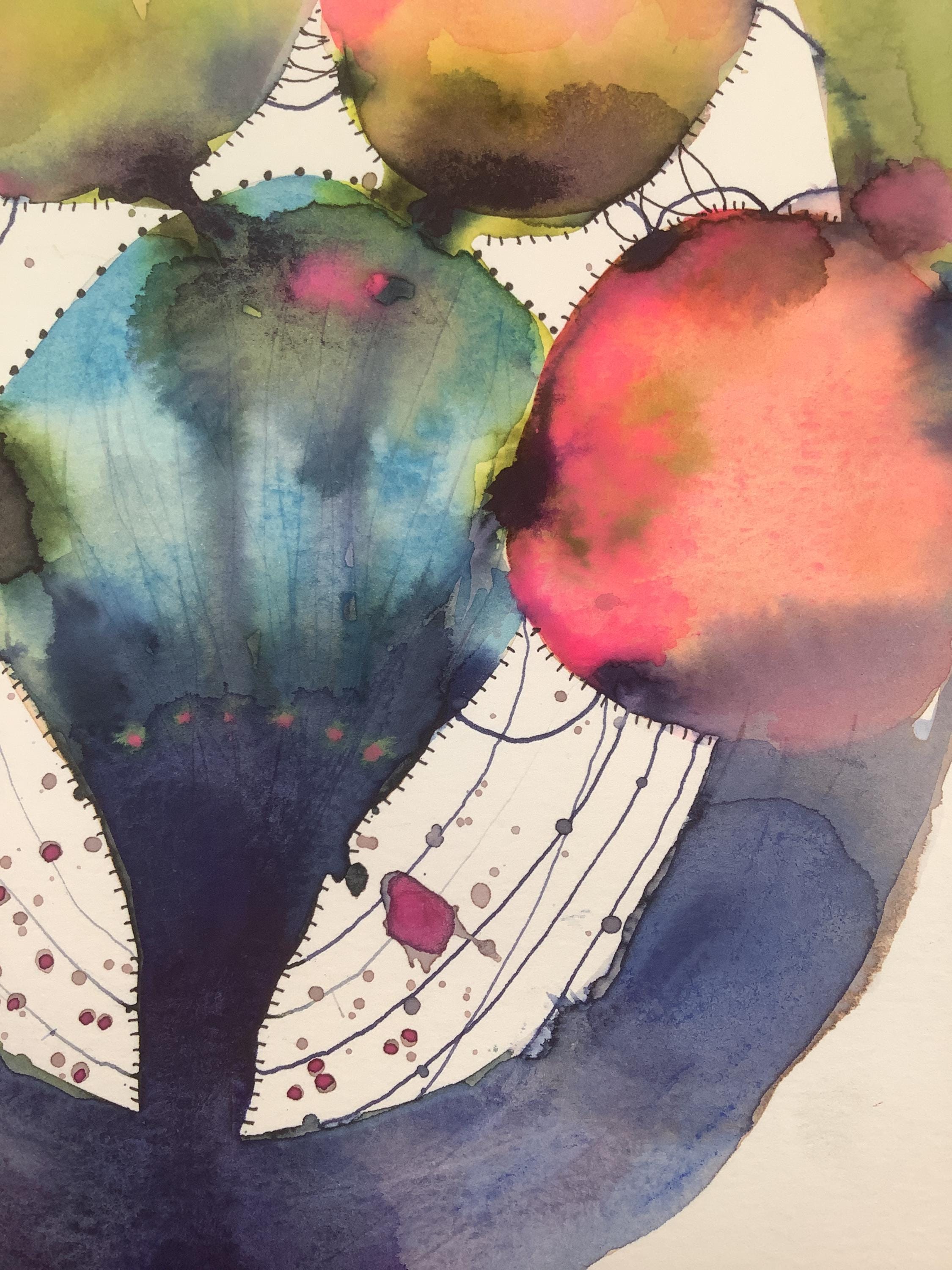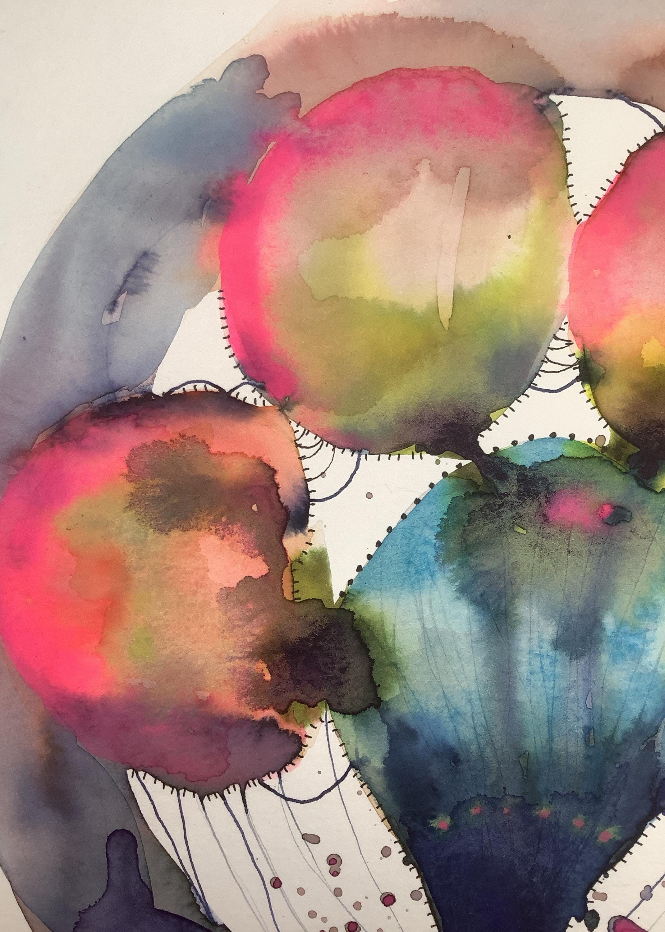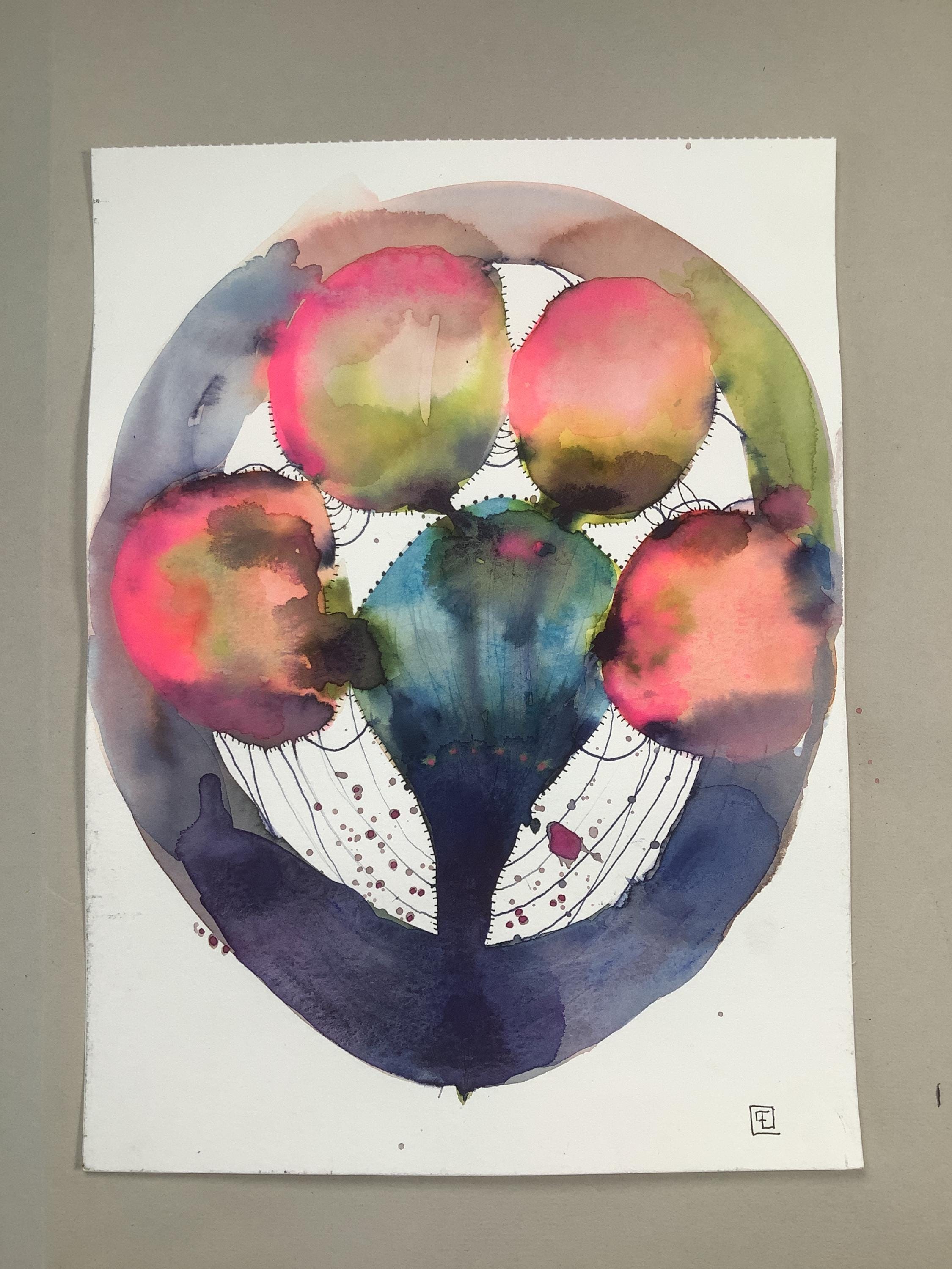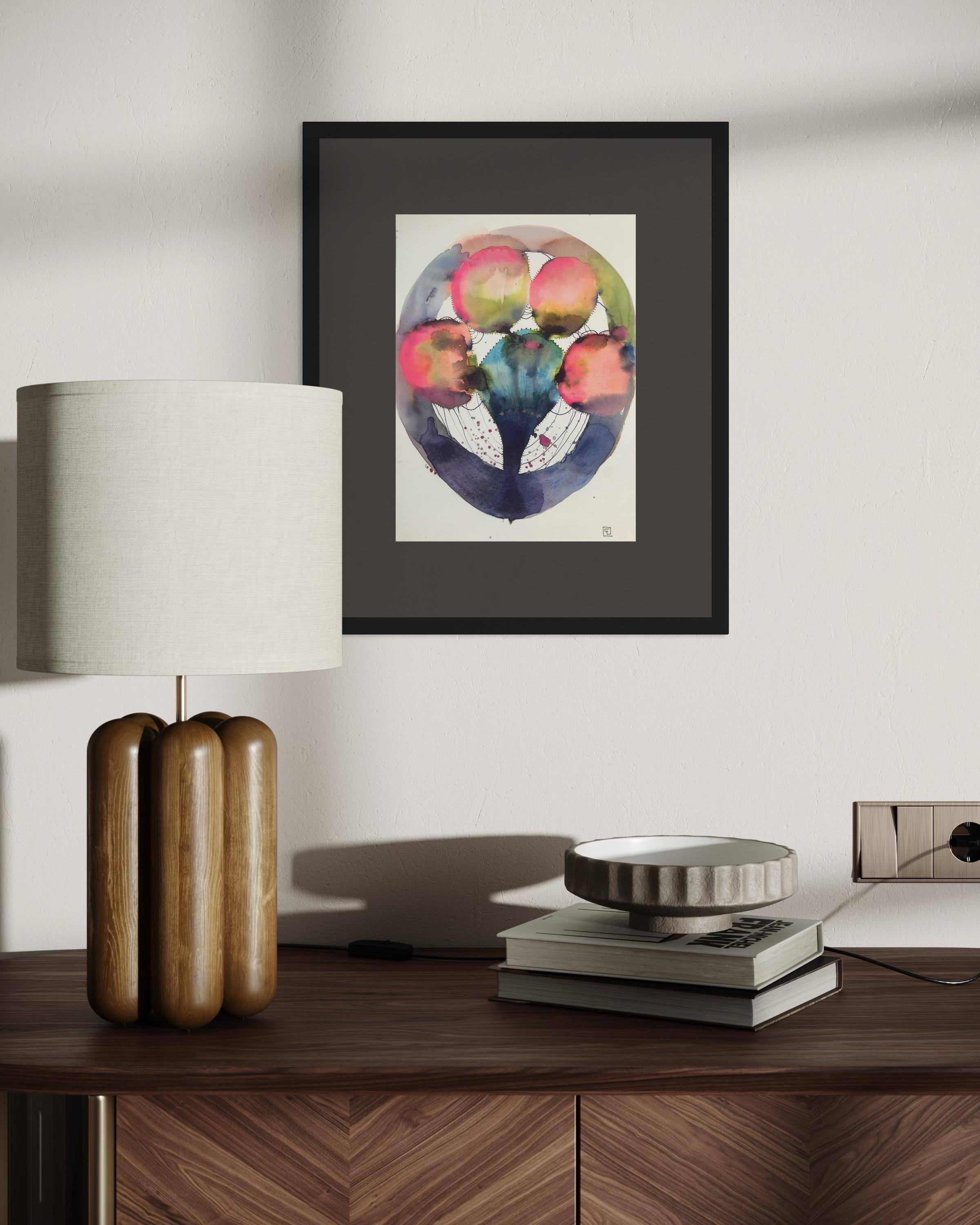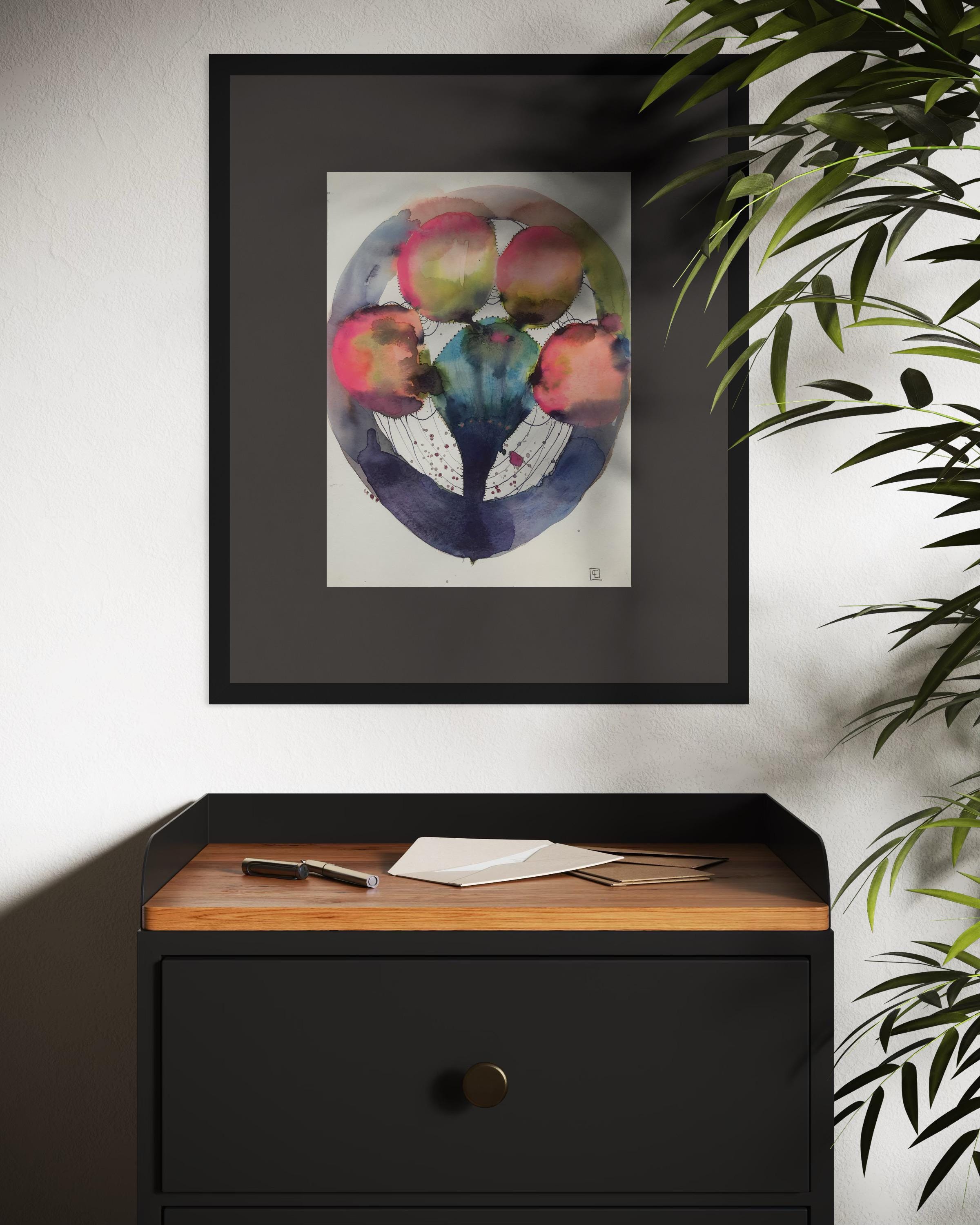 Created with delicate layers of watercolor and ink on paper, this piece reveals a symphony of vibrant colors, evoking nature's rich palette. The artist's virtuoso technique lends depth and texture to the composition, inviting you to explore its every detail.