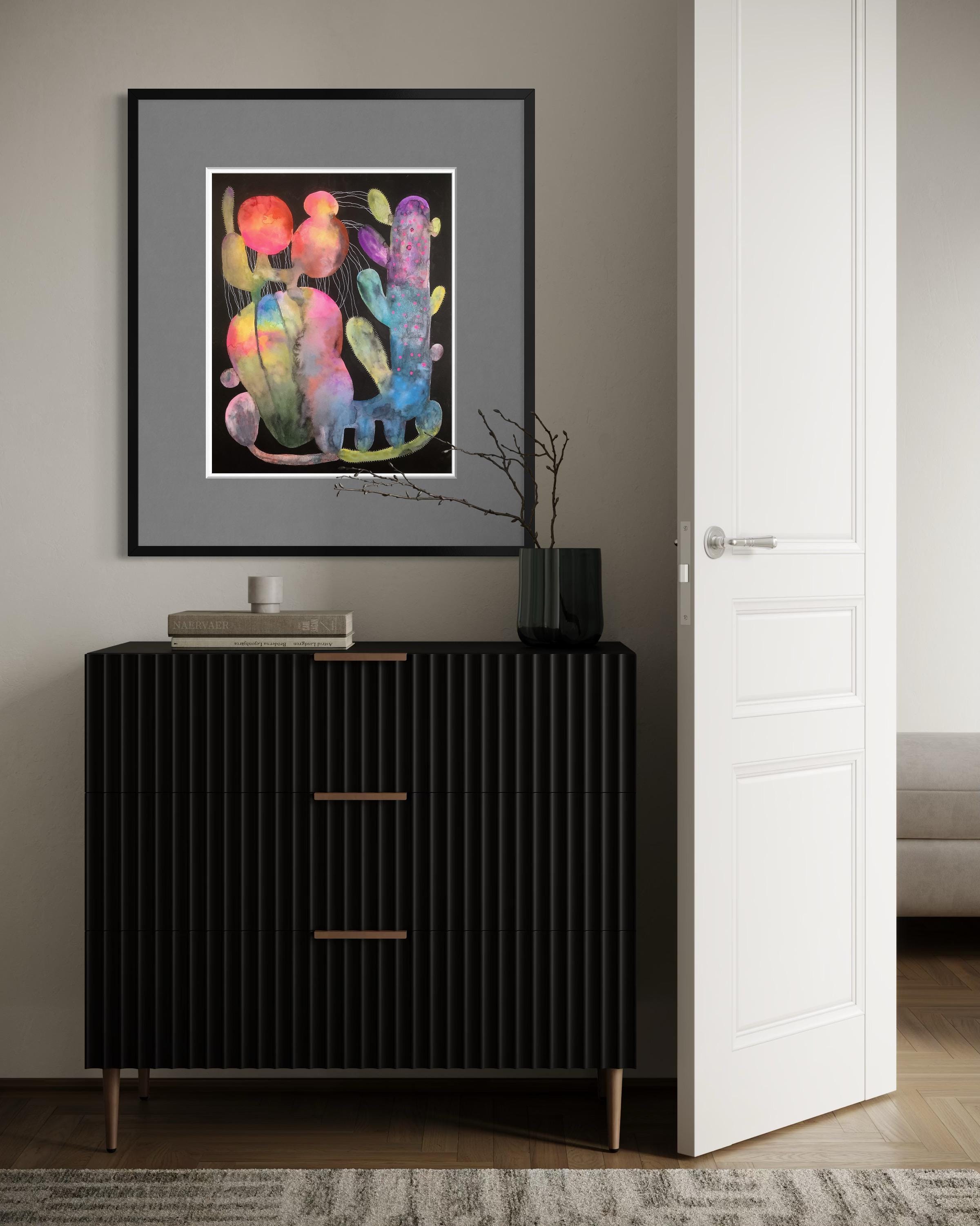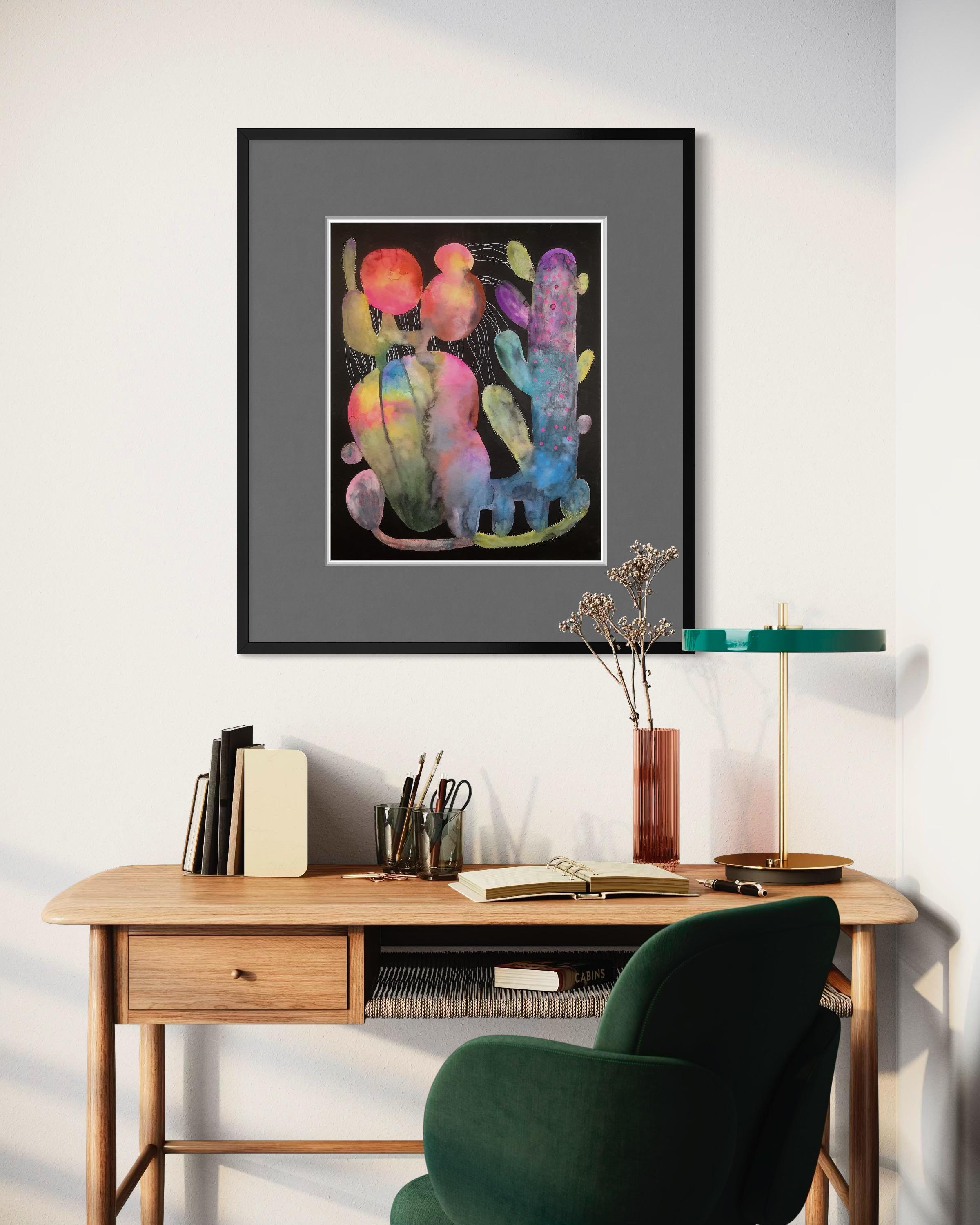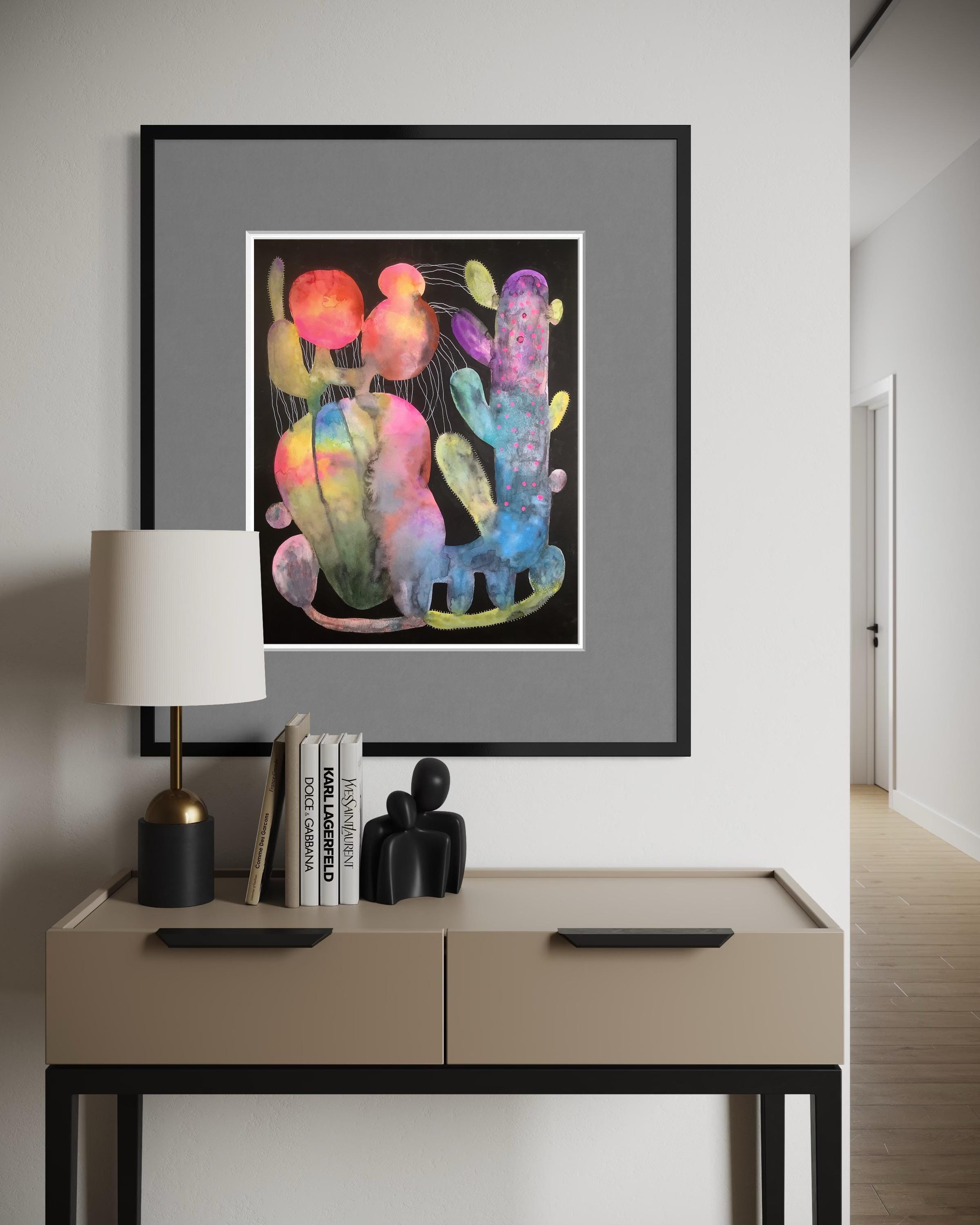 Crafted with a blend of watercolor, ink, and acrylic on paper, the colors explode with life. The bright hues gain even greater intensity against the stark contrast of the matte black background. This technique adds depth and makes the colors truly pop.