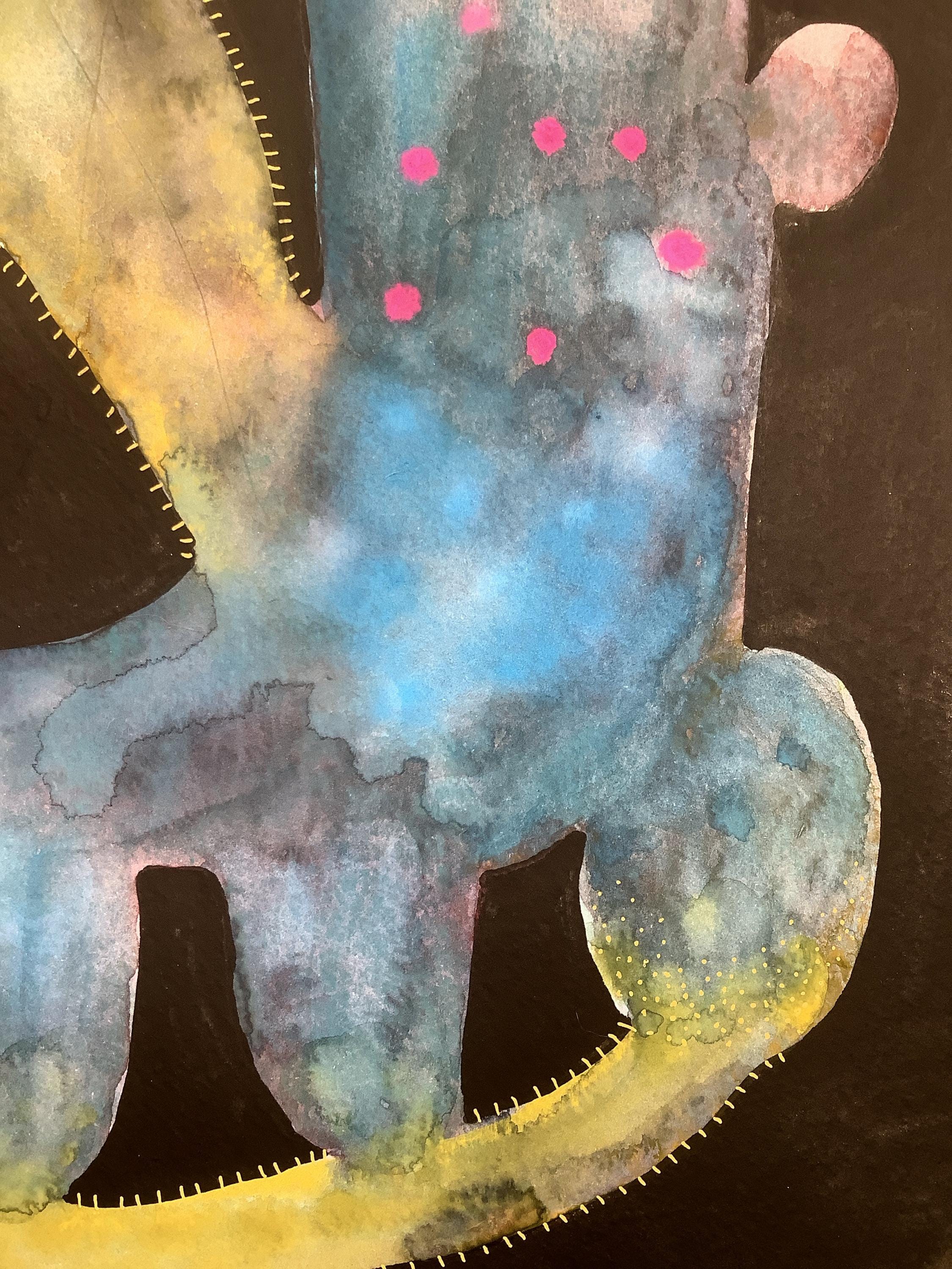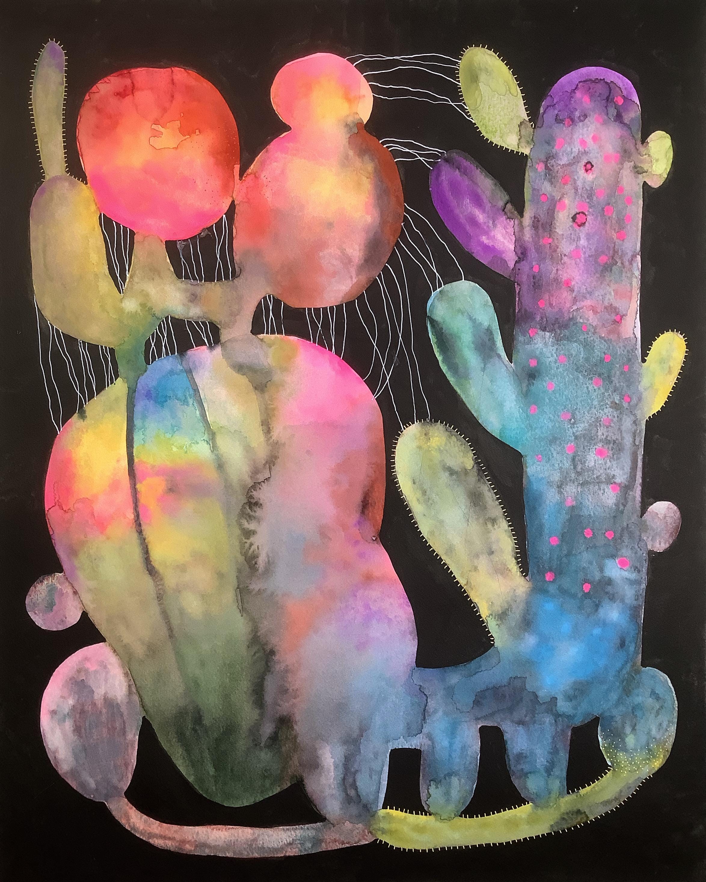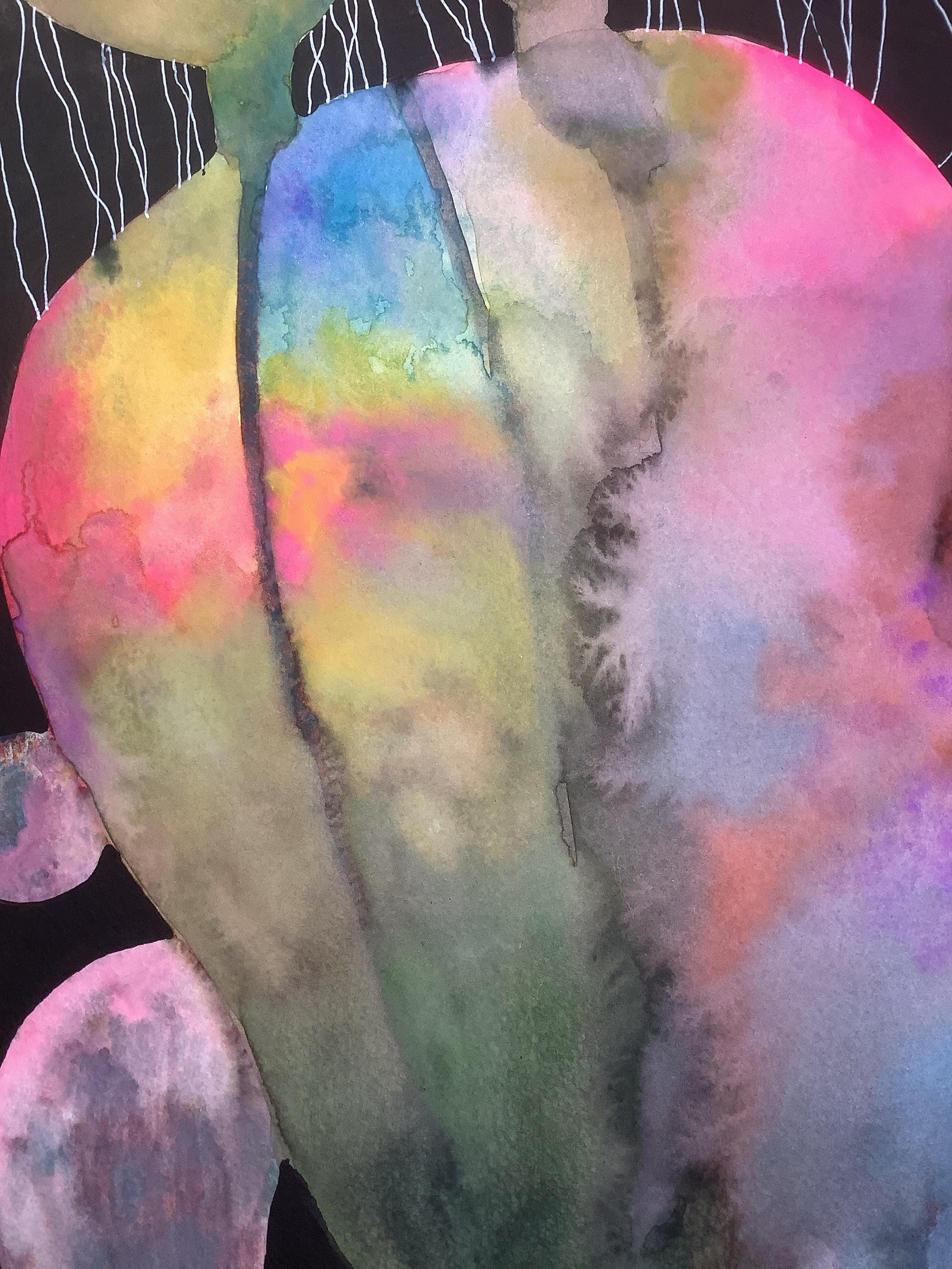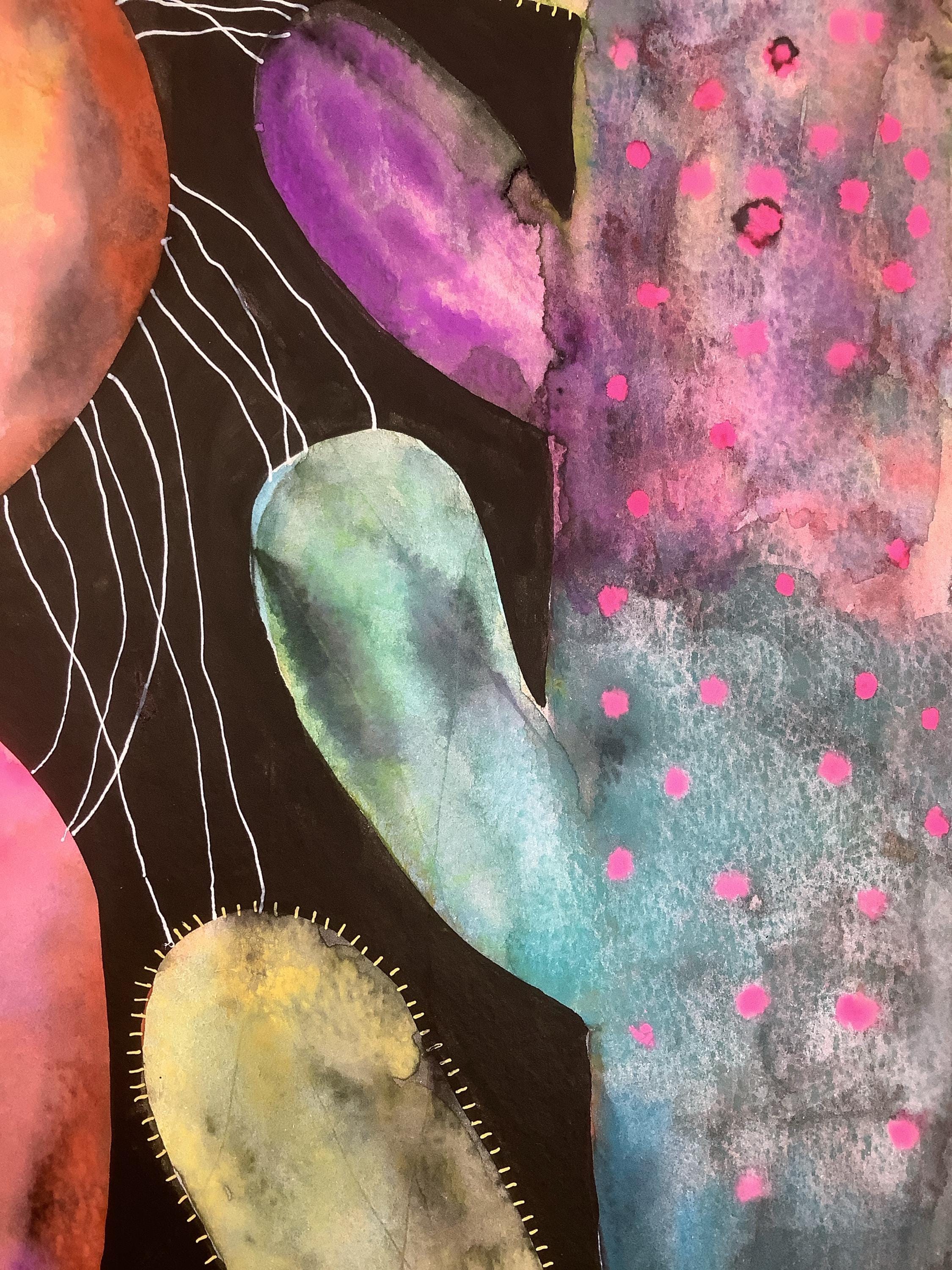 Crafted with a blend of watercolor, ink, and acrylic on paper, the colors explode with life. The bright hues gain even greater intensity against the stark contrast of the matte black background. This technique adds depth and makes the colors truly pop.