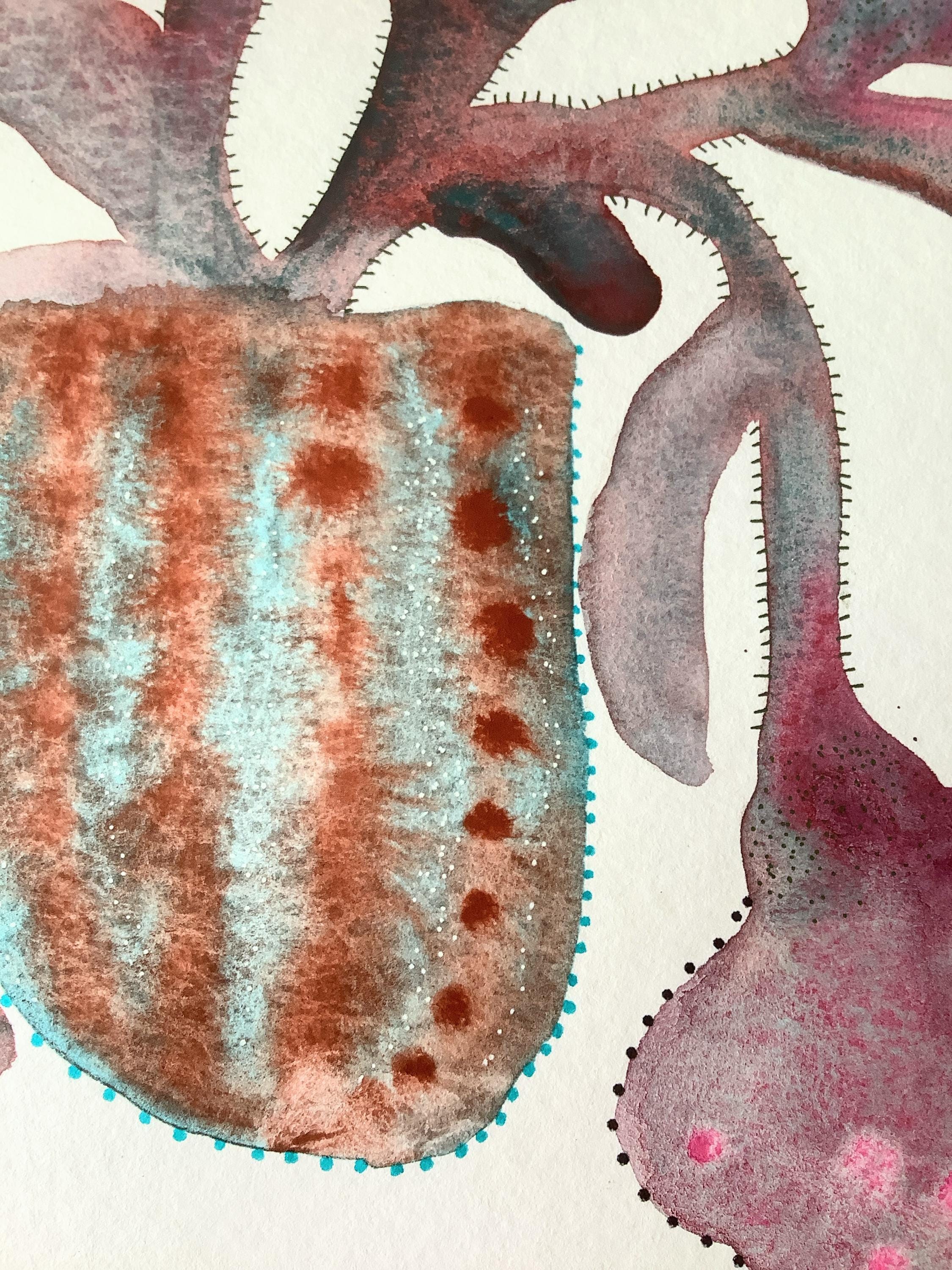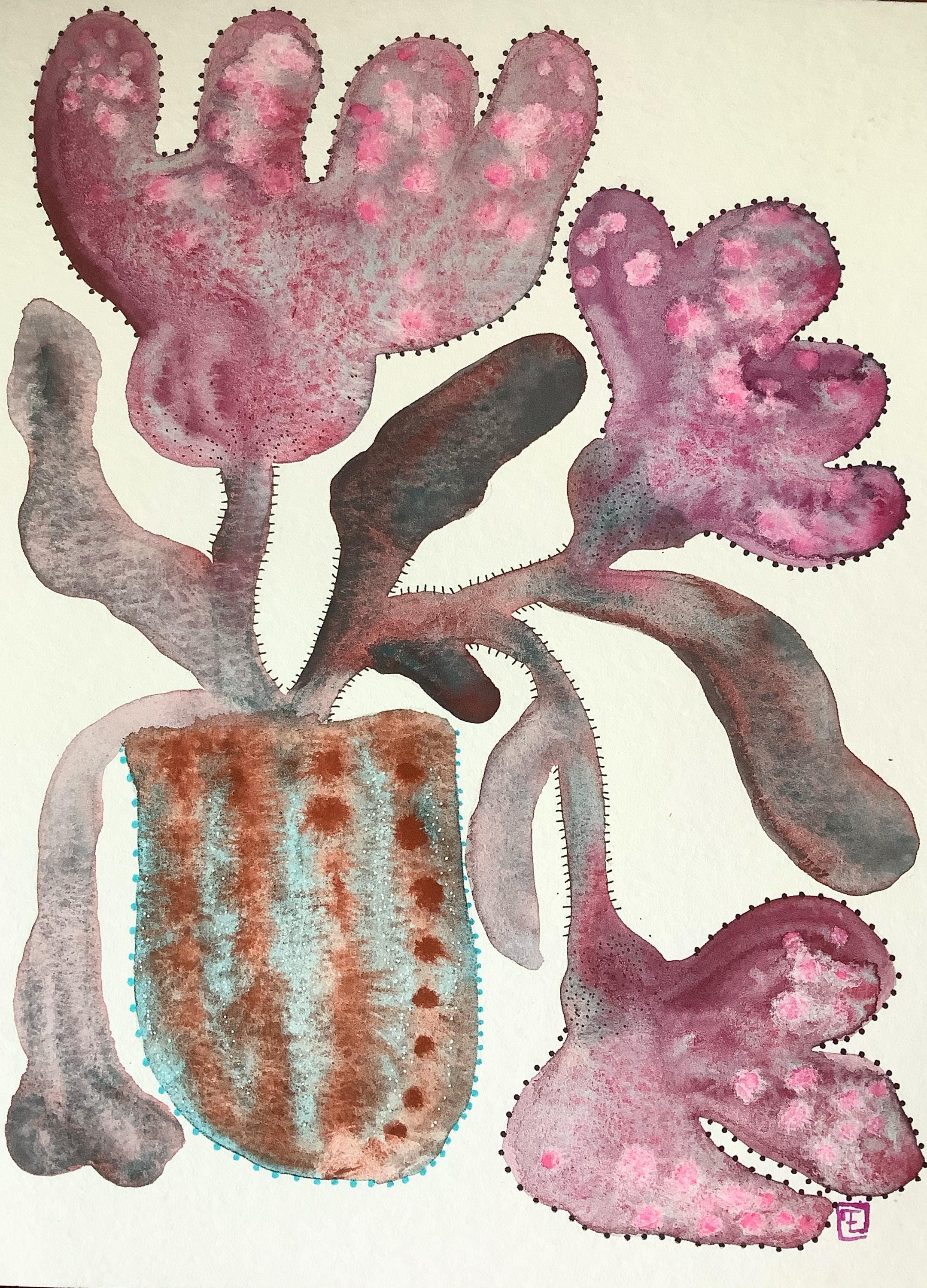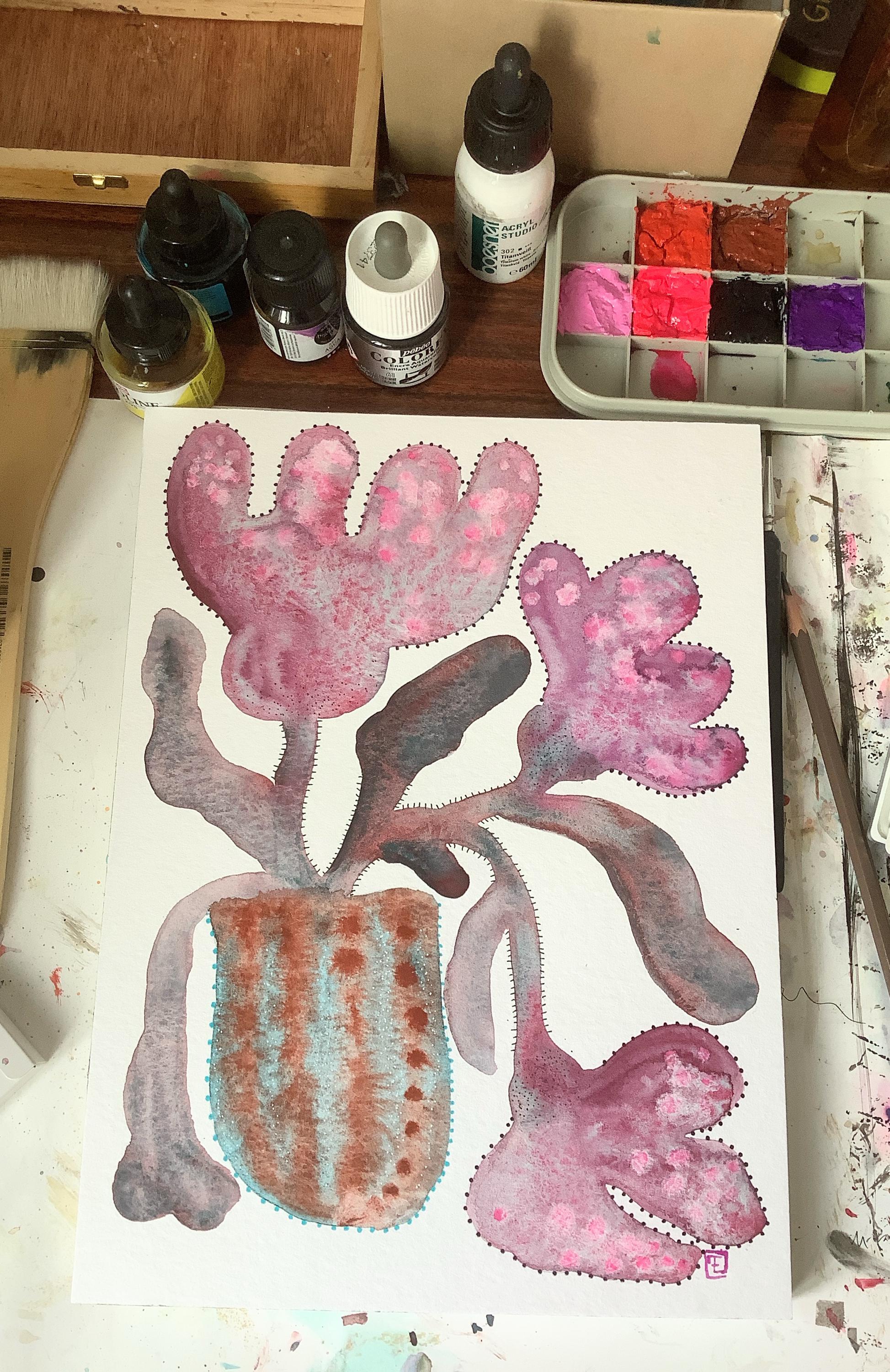 "LOOSE FLOWERS" is an original watercolor painting that depicts abstract flowers in a vase. The artist has used delicate watercolor techniques, with details added in gouache and ink. The combination of mediums creates a layered effect, with the fluidity of watercolor contrasting beautifully with the more opaque gouache and the precision of ink.