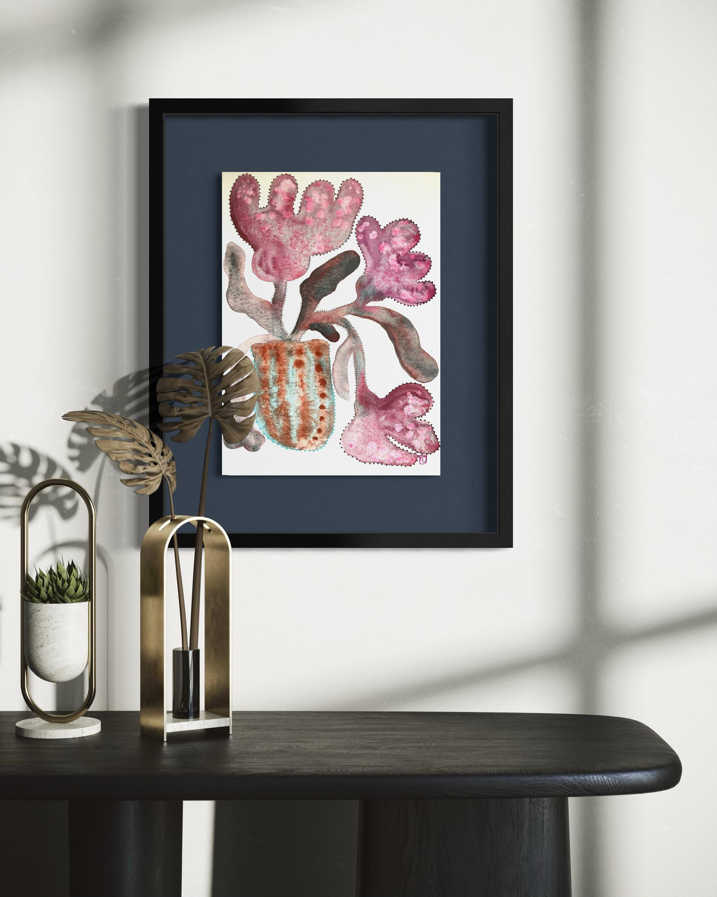 This beautiful, medium-sized painting brings a touch of nature indoors. The abstract yet figurative style allows the viewer to interpret the piece in their own way, evoking a sense of joy and serenity. The botanic subject matter makes it a perfect addition to any room.