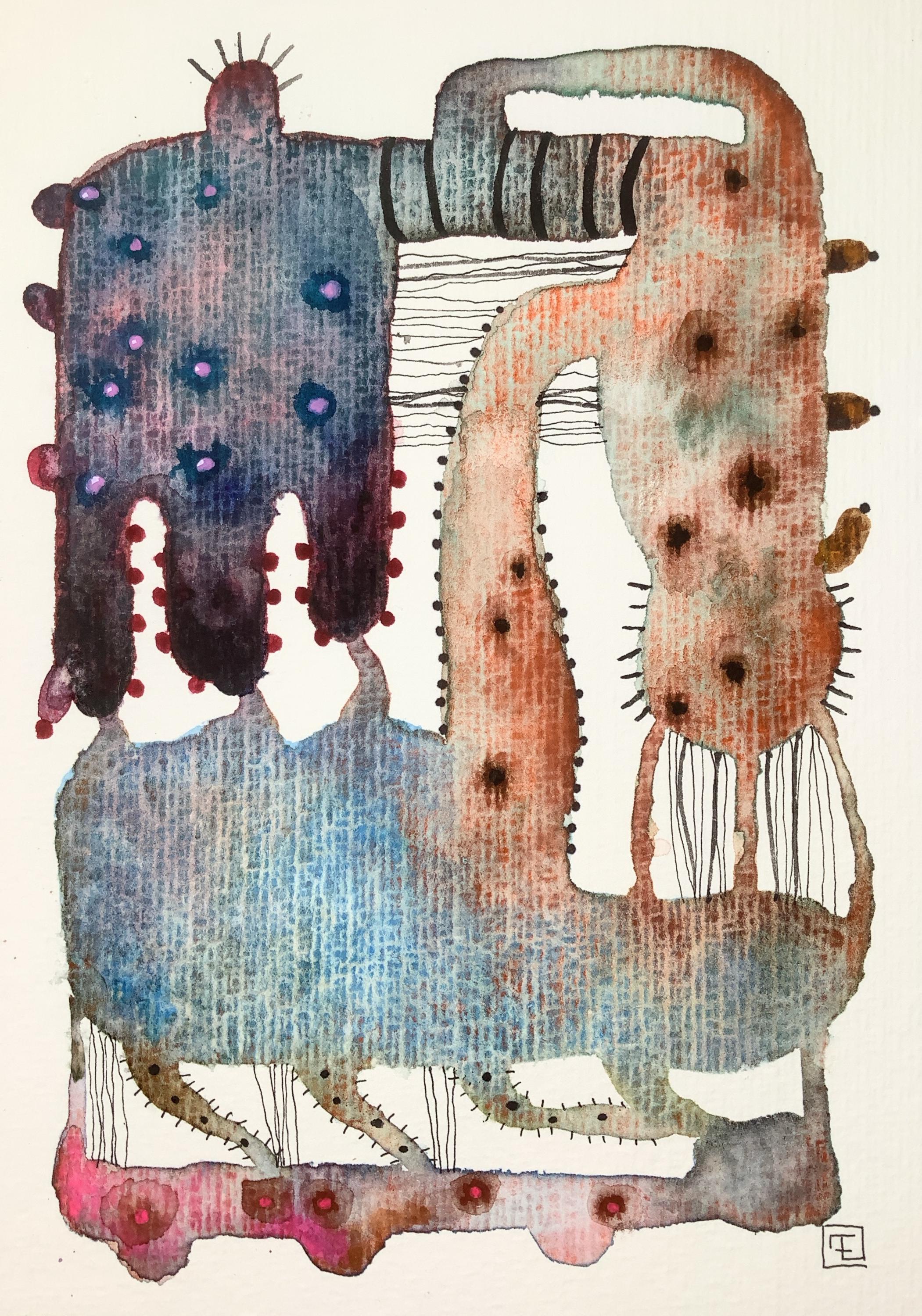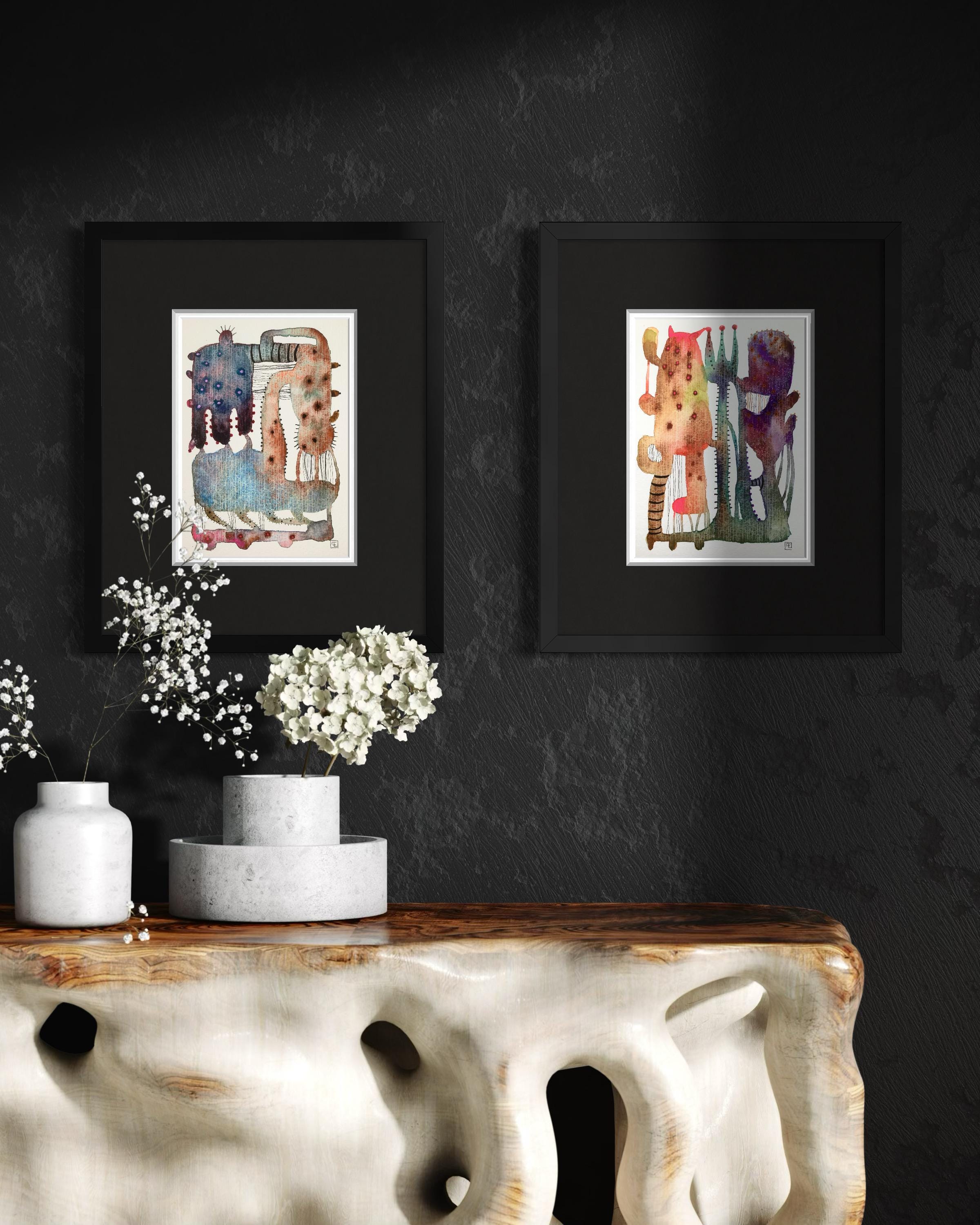 This delightful set features two colorful abstract paintings, each a unique exploration of form and color. Created with watercolor and ink on paper, the artist's hand is evident in the fluid lines and vibrant washes.