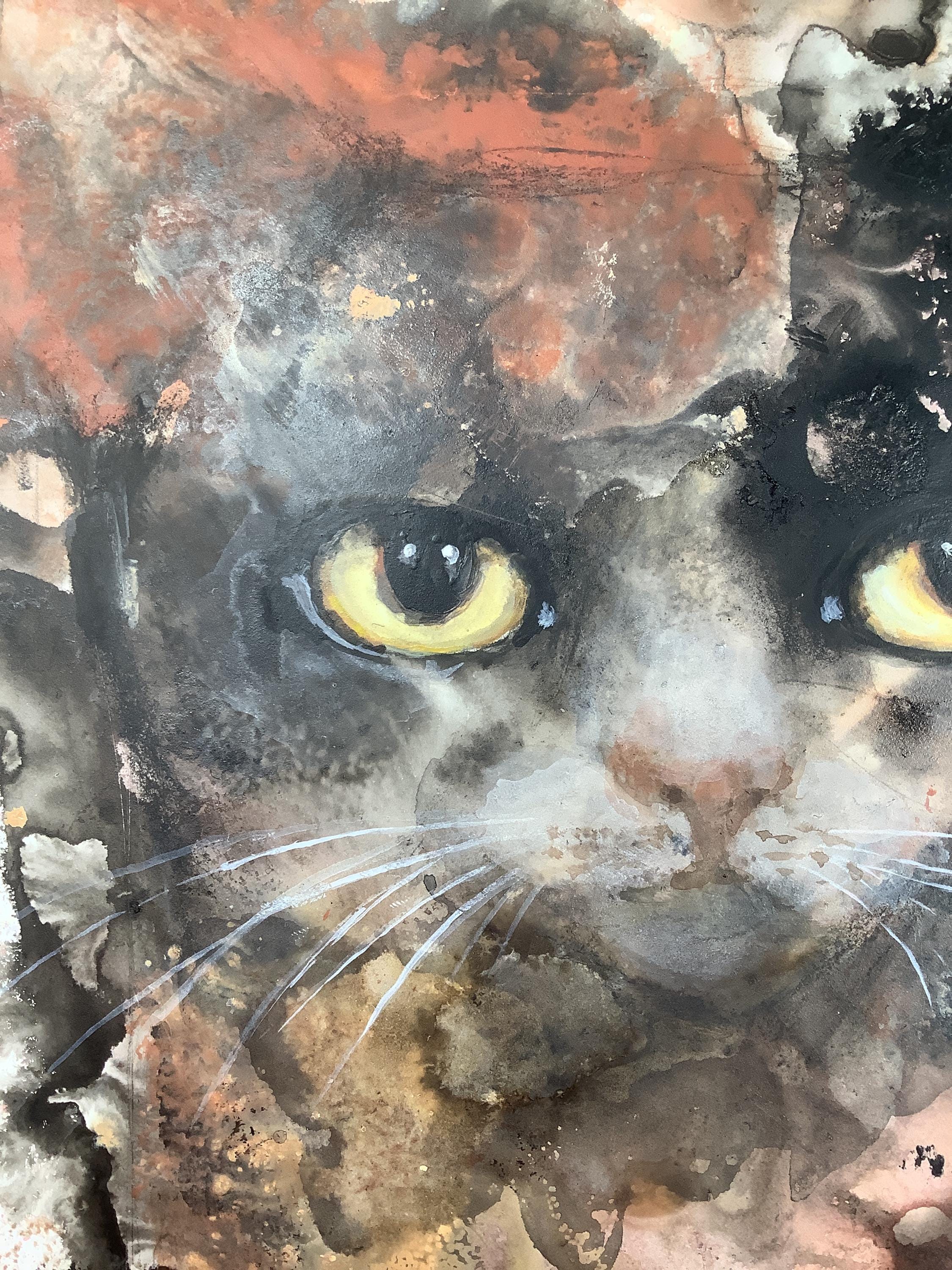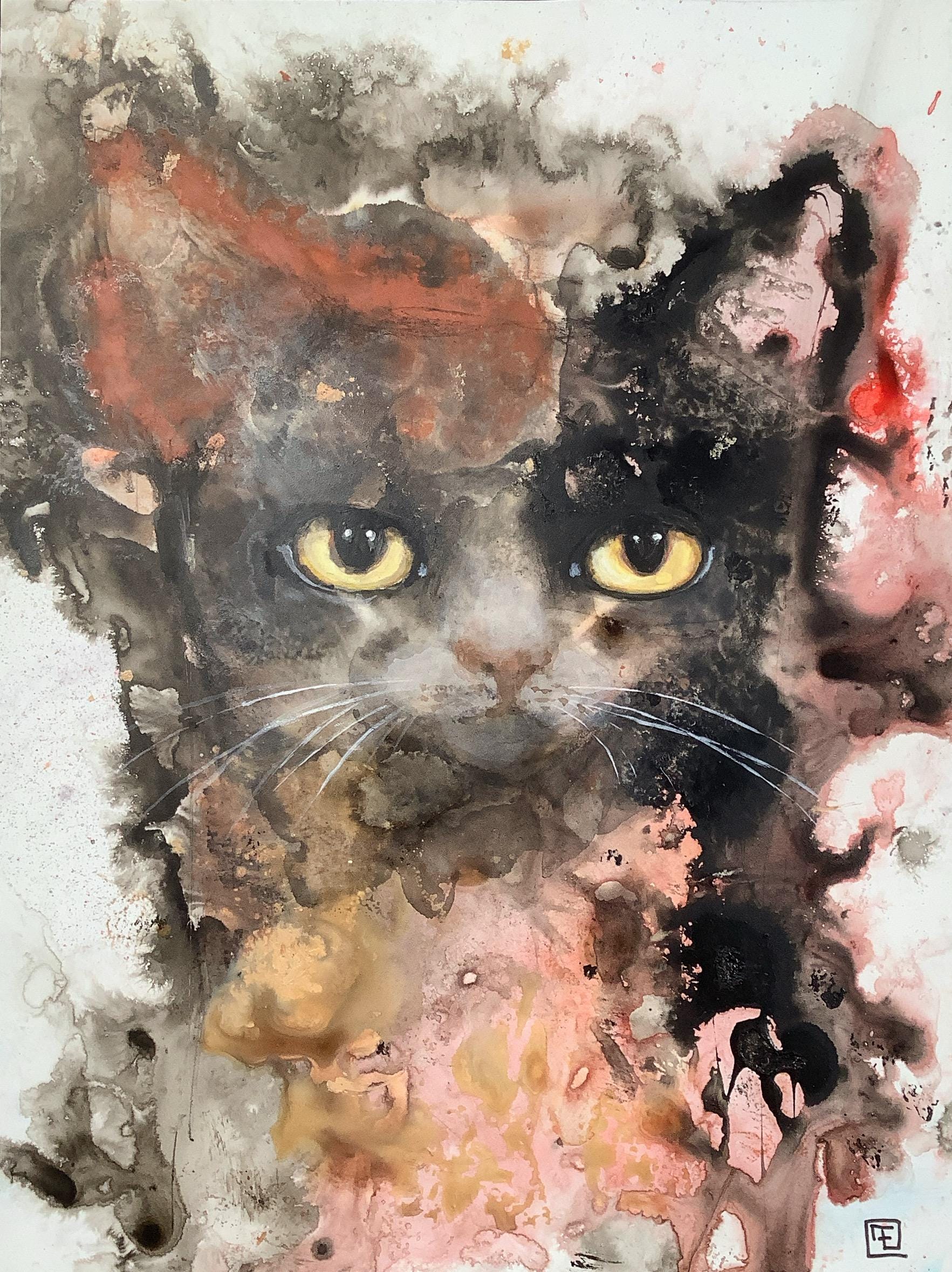 Abstract kitty, original acrylic ink painting on mineral paper, kitten portrait, Eva Fialka
