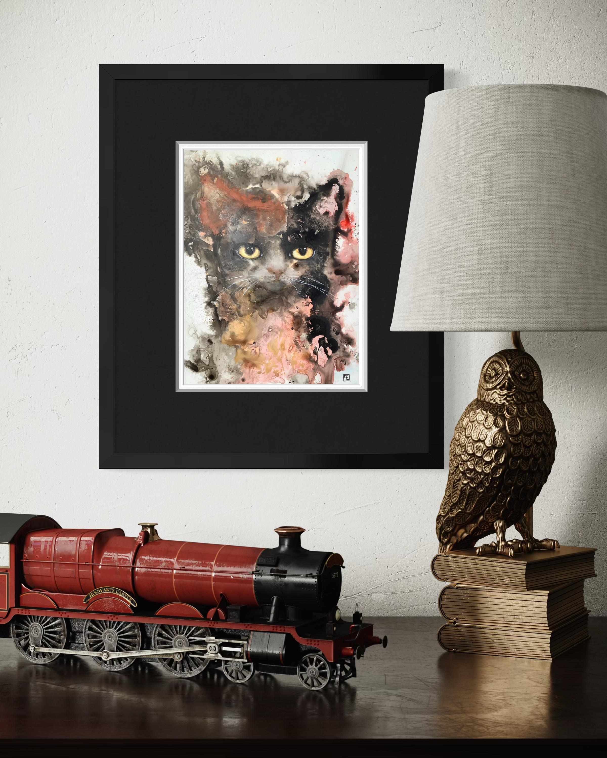 This original painting, "ABSTRACT KITTY", presents a unique and charming abstract cat portrait. The artist's skillful use of acrylic and ink on smooth mineral paper creates a captivating visual experience. The artwork blends abstract and figurative elements with a touch of impressionism.