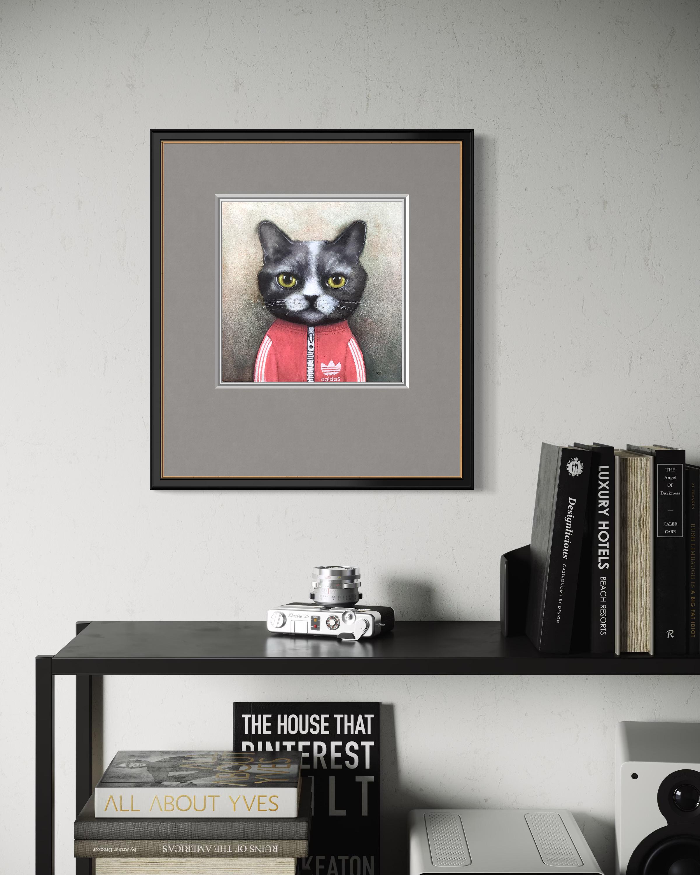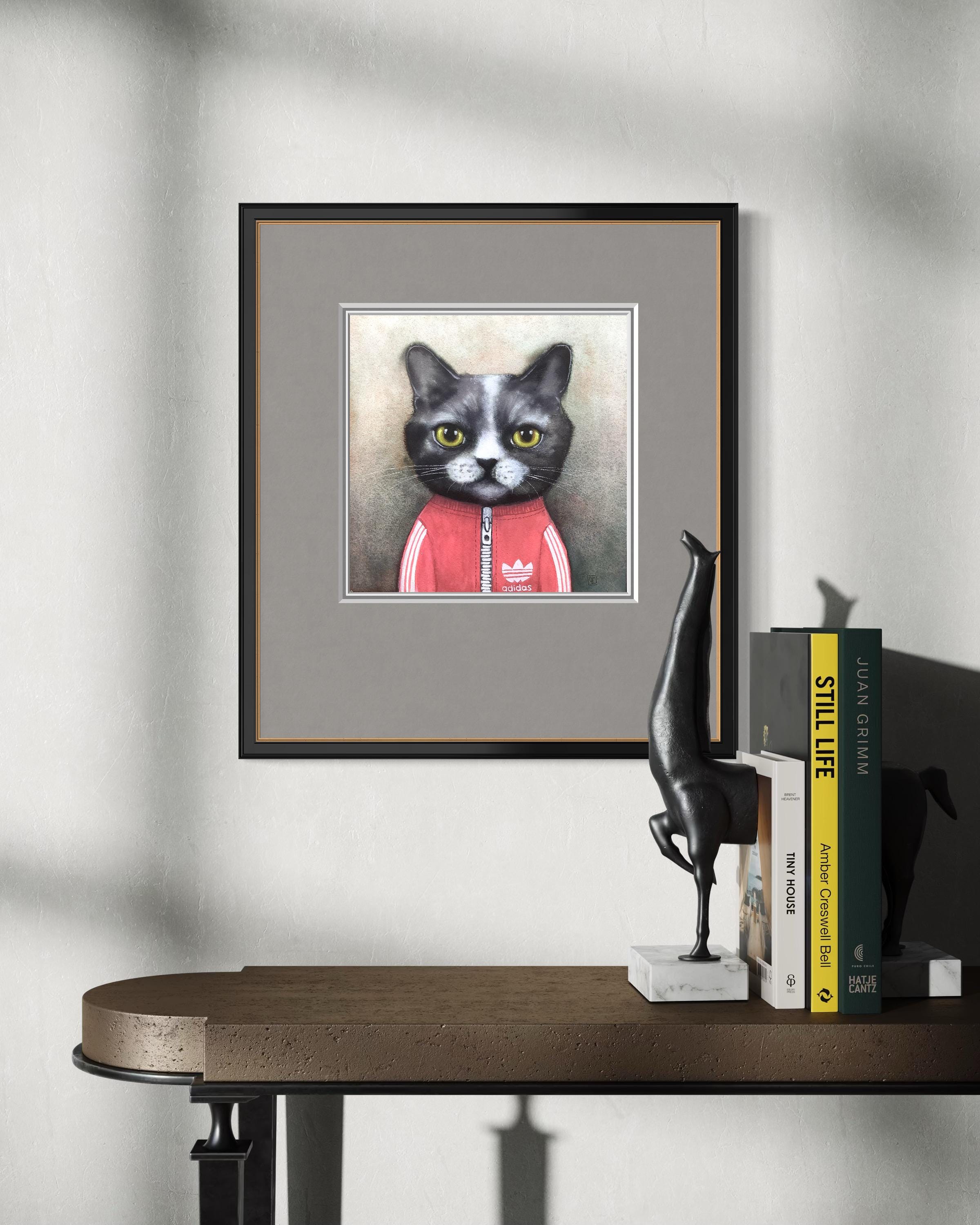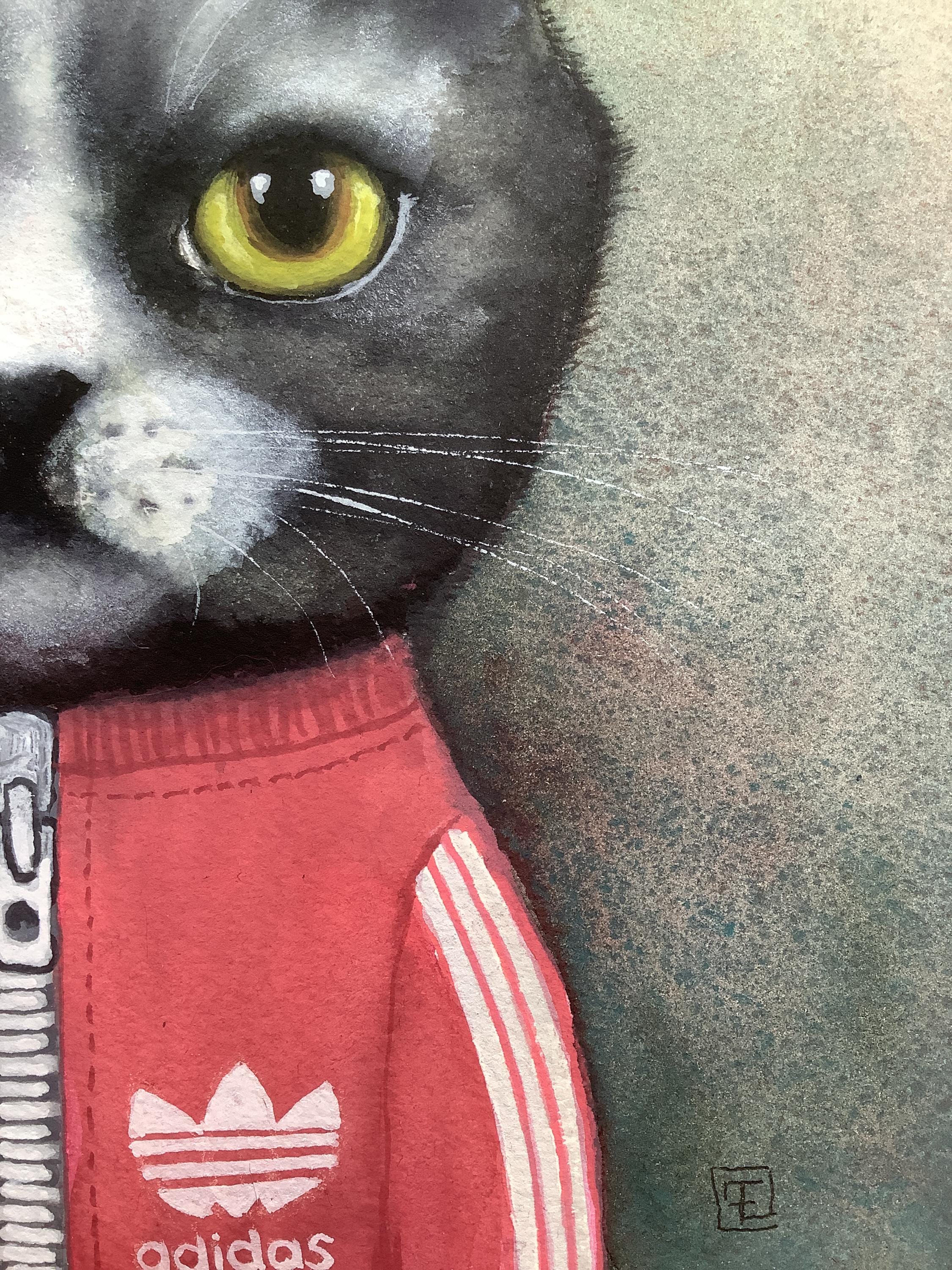 ALBERT" is a charming original painting that captures the quirky personality of a cat. This delightful portrait features a feline friend sporting a vintage tracksuit, his expressive eyes full of character.