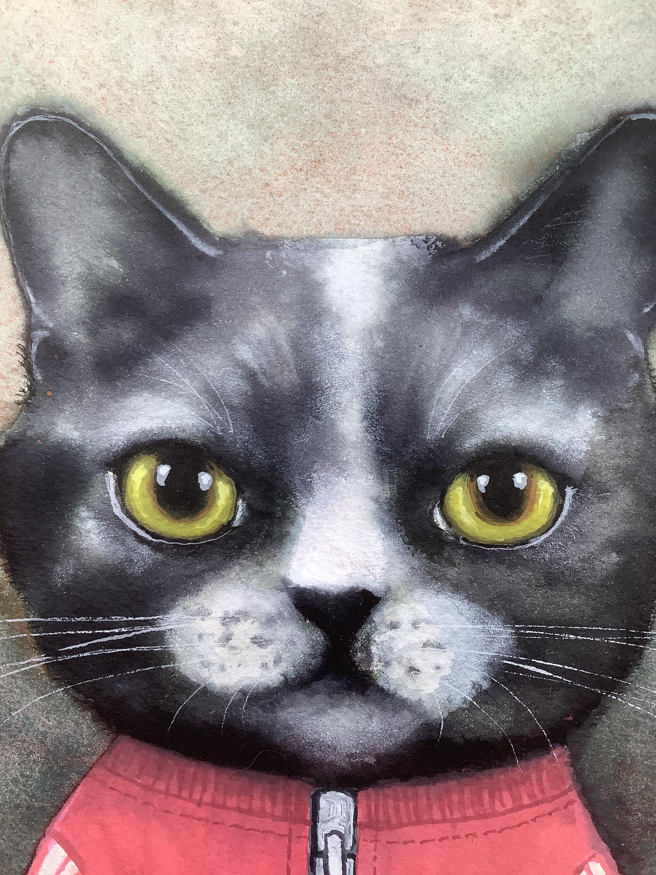 Crafted with watercolor and gouache on paper, the artist's technique brings a soft, endearing quality to the piece. The combination of these mediums creates a rich texture and vibrant colors, making the cat's unique attraction and features truly stand out.